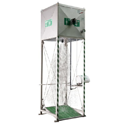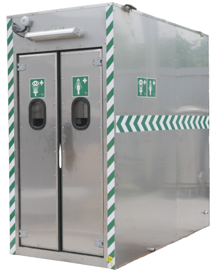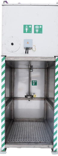 Material frame, side panels, piping and tank: stainless steel Insulation: PIR Tank capacity: from 350 l to 2000 l. 3 kW bath heater for tank 3 kW heater for cabin Cabin with – Catch basin Water inlet: 1 ¼ ” female Water outlet catch basin: 2” female Ball valve: stainless steel/brass High-performance shower head: plastic, chemical resistant or stainless steel Activation: push rod inside the frame, testing lever outside on the frame Power supply: 230 V/50 Hz (other power supply on request) Ex-protection: are suitable for operation in hazardous areas 1 & 2 Flushing times: at least 15 minutes Volume flow: 40 l/min standard / 76 l/min with option Many available options on request